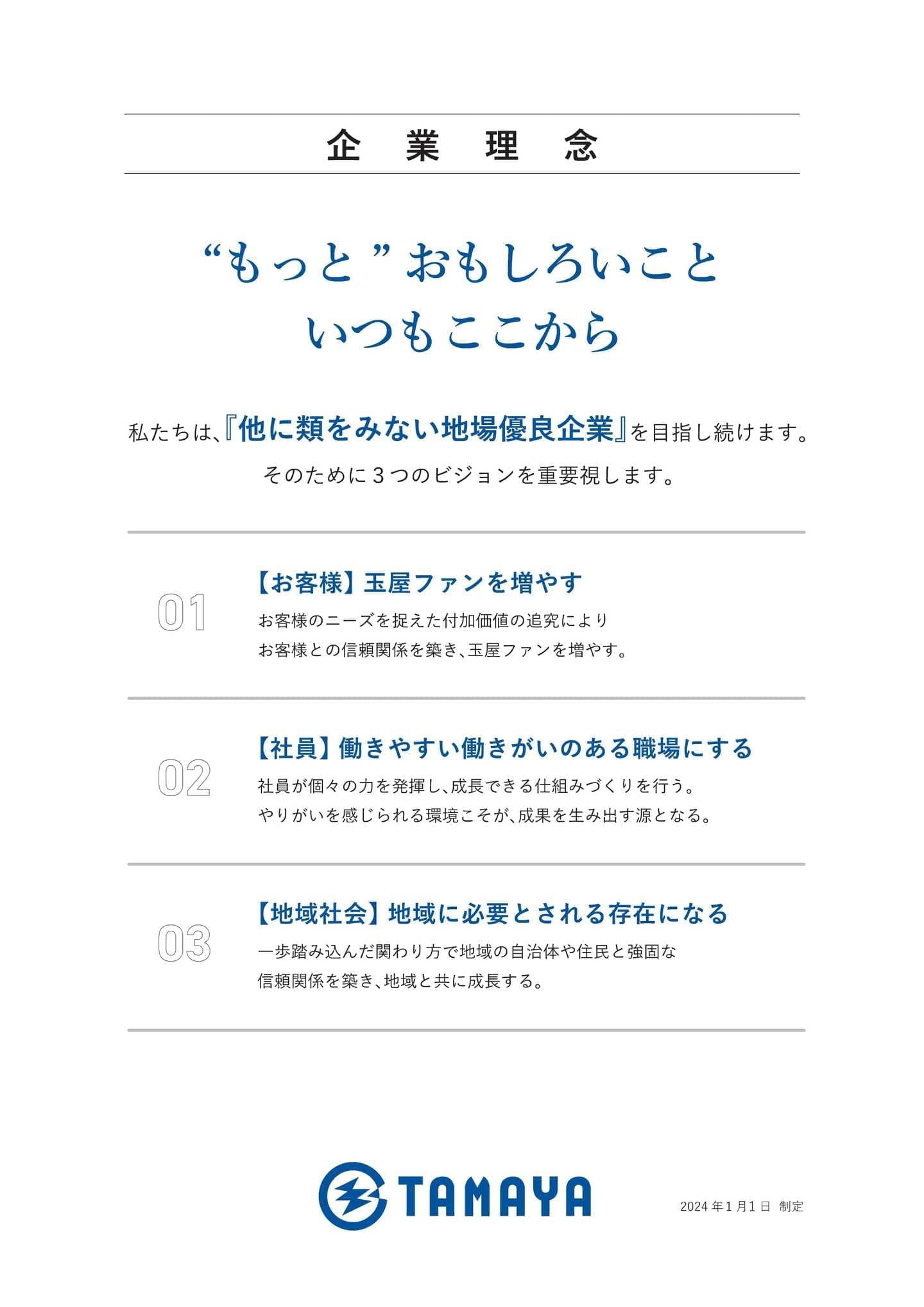 1953年、玉屋は福岡県飯塚市で創業し、以来「健全な大衆娯楽の追究」「地域への貢献、地域との共生」の理念のもと経営を行なってまいりました。おかげさまで今年創業72年を迎えます。こうして長く経営出来ておりますのもひとえにご来店いただいているお客様、地域の皆様、取引先の皆様、社員とその家族、多くの方々のご愛顧とご支援の賜物です。心より御礼申し上げます。